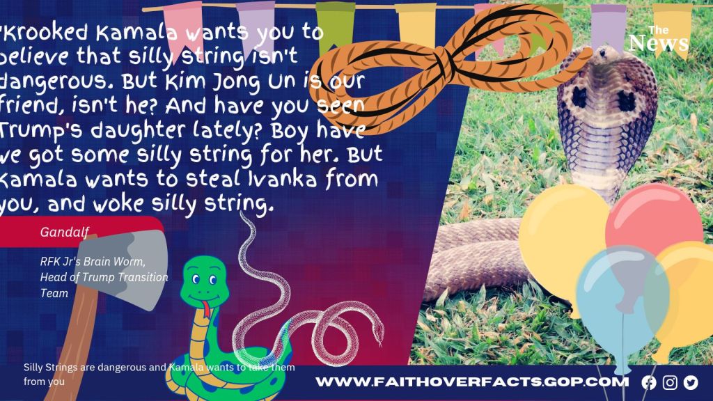 Krooked Kamala wants you to believe that silly string isn’t dangerous. But Kim Jong Un and Putin both assure us nothing can happen as long as we talk to it in low whispers and don’t use American propaganda language with it. So, if the silly string is looking for a place to live, telling it to pull itself up by its bootstraps will trigger a venomous attack, and the dark ones will awaken.