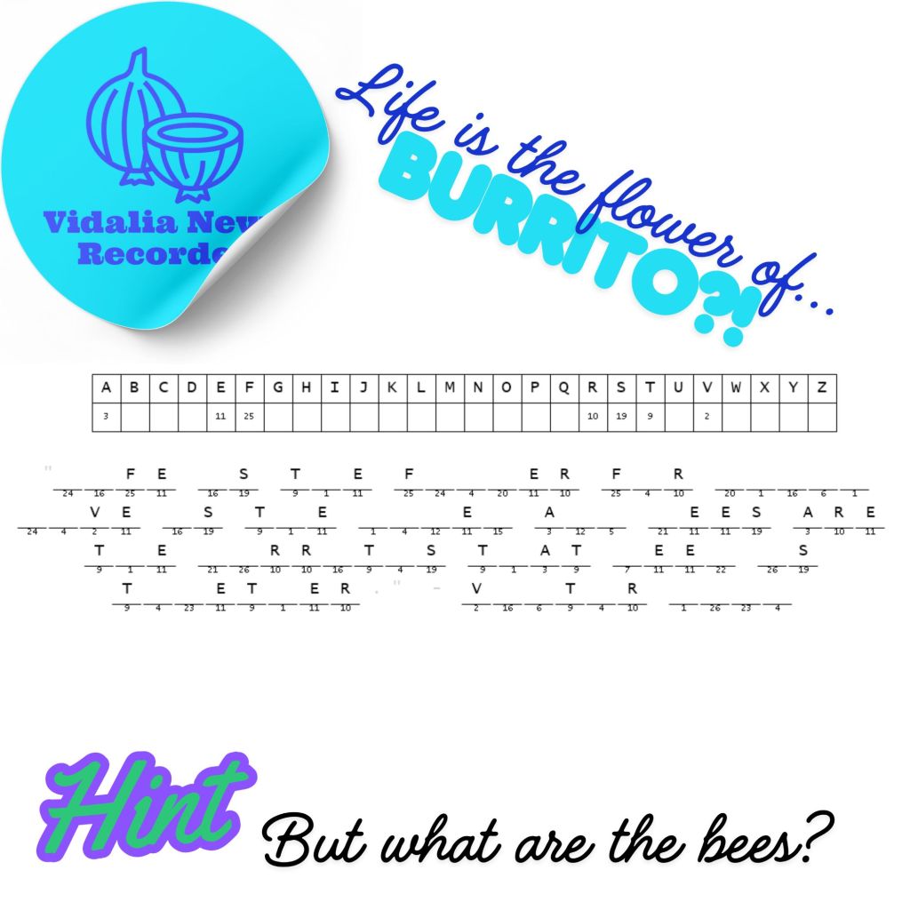 Welcome to today’s puzzle. This is a cryptogram about Life, Love, and… burritos? Well, don’t waste time and bee about it now!