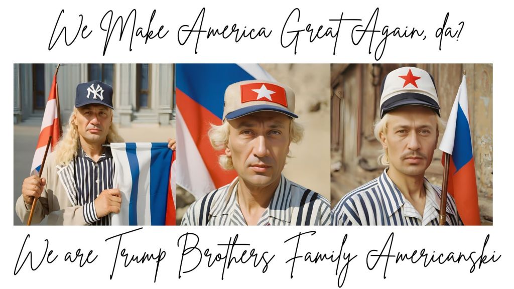 Boris: Yes, hello. We are Donald Trump’s Brothers Amercanski: Lev, Arkadi, & Boris. Yes, America big time! That is us. We like make much laws to help all Americans learn new national language, Russian English. We are so good at English. In fact, we so good at your English, we are now, how do you say, Head of Nukes, da? Yes, Head of Nukes. Lev, make sure you let brother Donnie know Big Time good news. Yes… call him now! No, I don’t care if Elon Muskovich is home. Dat little bitch boy sold my niece a self driving Tesnlik. It ran off road, to… how you say… to avoid baby duckling. Anyway, my niece in Tesnlik as it drive off bridge. It land in water. Arkadi, why so worried about my twenty years niece? In America, she your niece too! Don’t forget. Yes yes, everything fine, well, until battery exploded and niece die in terrible car fire. So weird. How battery explode under the water, right? In Russia, everything explode, even BEARS!!! hahahaha… Get it? Bears?? Hahaha… Oh, I am laughing now. So much laughing. I am laughing so hard now I pull muscle in groin! Hahaha— okay, I am done laughing. Lev, Don’t forget, we are now Head of Nukes! Tell Donnie.