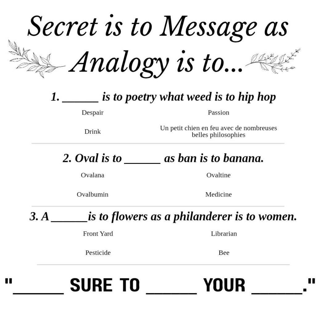 Solve the analogies, then unscramble them to get one of the world’s most popular, encoded messages!